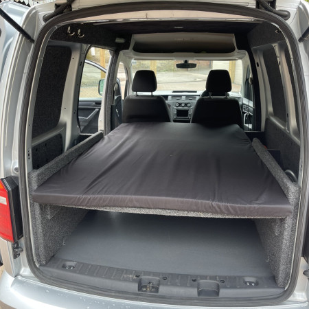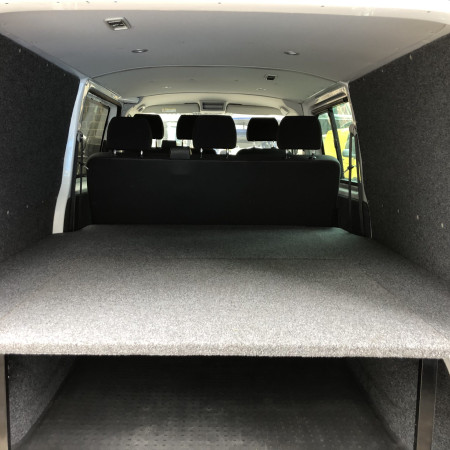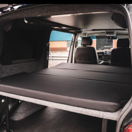 Our custom made komby camper bed design allows for a 5 to 6 seats for the family, a work van through the week and a comfortable 2 or 4 berth camper van for going away in on the weekend. With storage space under and on top of the bed when not in.